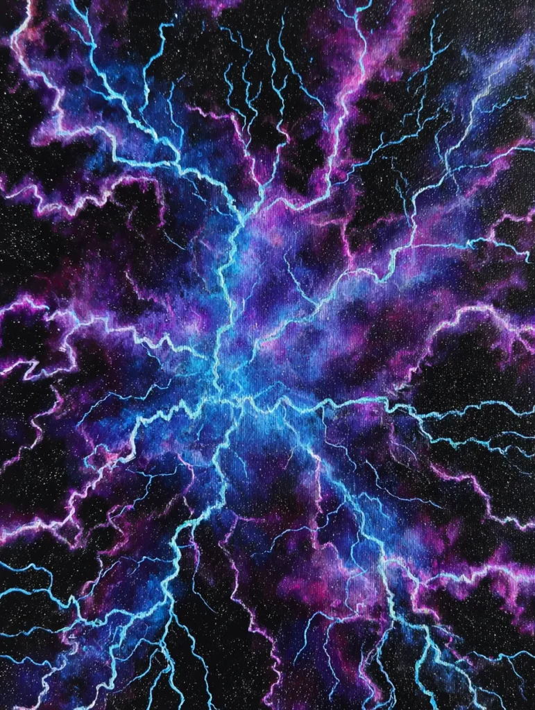 Jagged forks of cyan and electric blue lightning crackle outward from a glowing center, cutting through a hazy atmosphere of violet and deep magenta. Soft, sponged layers of paint create a nebulous, cloud-like effect in the background, while crisp, thin lines provide the sharp contrast of the electrical discharge. The composition is expansive and centered, using the dark canvas to mimic a deep night sky or the far reaches of space. Tiny white splatters add a final layer of detail, making the entire scene feel like a high-energy celestial event.