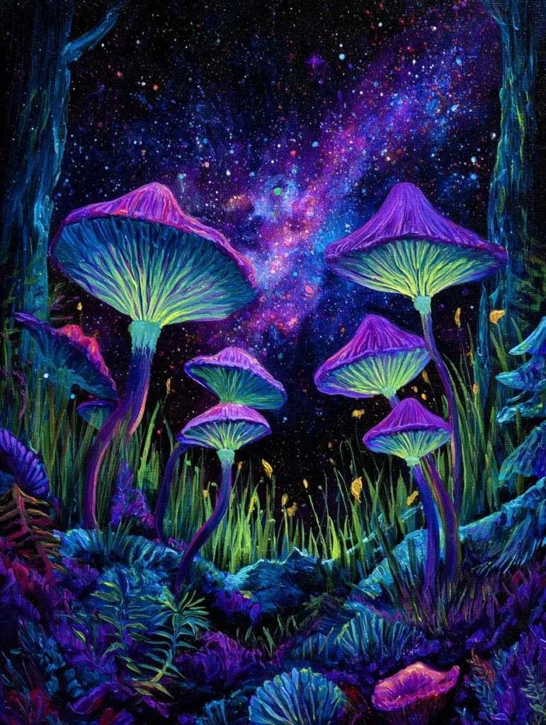 Bioluminescent purple mushrooms with glowing neon green gills stand out against a dense thicket of forest flora and a glittering galaxy backdrop. Tiny, precise brushstrokes define the intricate patterns on the mushroom caps and the surrounding ferns, while soft sponging creates the hazy, multidimensional look of the purple nebula. The layout frames the whimsical scene with dark tree silhouettes, leading the eye toward the shimmering center of this magical woodland landscape.