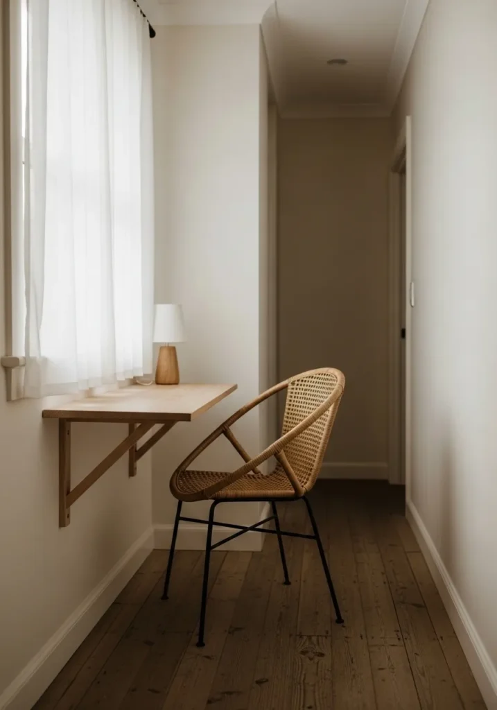 This tiny home office is tucked into a narrow hallway space, yet it feels surprisingly open and calm. The walls are painted in a soft creamy white that reflects the natural light pouring in from the side window. Sheer curtains keep the sunlight gentle and diffused, which makes the whole space glow instead of glare. A slim floating wooden desk runs along the wall, paired with a woven rattan chair that adds texture without visual heaviness. The warm wood floors ground the space and give it that cozy lived in charm that makes a small room feel intentional instead of cramped.