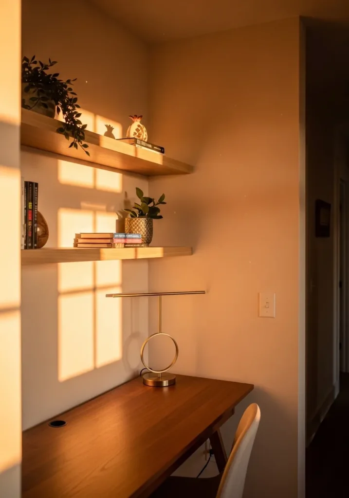 This small workspace is painted in a warm apricot tone that looks stunning in the late afternoon light. The sunlight streaming through the window creates long soft shadows across the walls and shelves, making the color appear rich and cozy. Floating shelves hold a few books and plants, while a simple wooden desk sits below, keeping the layout streamlined. The warm paint pairs beautifully with the wood tones, creating a cohesive and inviting feel.