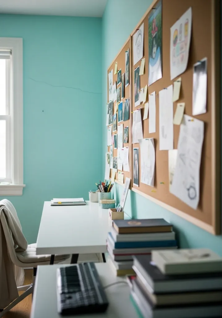 This compact office uses a vibrant teal to energize the narrow space. The bold color runs along the main wall, framing a large cork board filled with notes and inspiration. A slim white desk keeps the layout practical, while stacked books and simple accessories add lived in character. The teal reflects the daylight from the window, giving the room a lively yet still airy atmosphere.