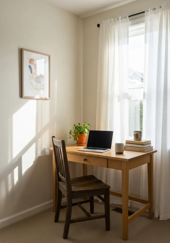 I love how this setup proves that even the most awkward corner can become something beautiful. The creamy paint color feels light and airy, but it is not cold or stark. It wraps the space in warmth, which I personally find so comforting when working from home. This is the kind of little office that makes me want to sit down with my planner and actually enjoy getting things done.