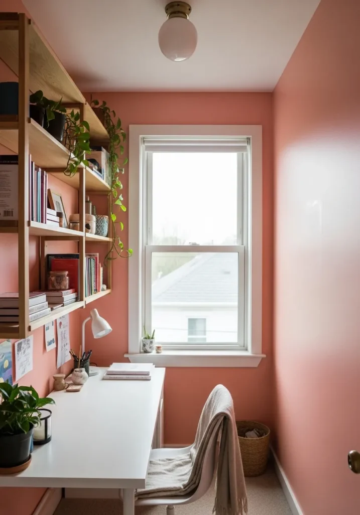 This long and narrow office uses a soft coral pink to brighten the walls from end to end. The color reflects natural light from the window, making the room feel warm and cheerful rather than tight. White shelves run along one side, filled with books and trailing plants that add texture and depth. A slim white desk keeps the footprint minimal while still offering enough space to work comfortably. The pink tone feels modern and uplifting, especially paired with the clean white accents.