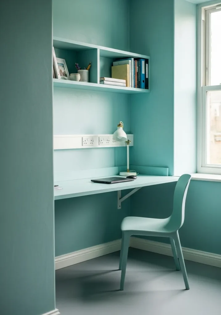 This compact desk nook is painted in a bright aqua blue that instantly opens up the space. The built in shelving above the desk keeps everything organized while blending seamlessly into the wall color. Natural light from the window enhances the cool tone, making it feel crisp and clean. The simple desk and matching chair keep the look cohesive and visually light. Even though the area is small, the color choice makes it feel purposeful and energizing.