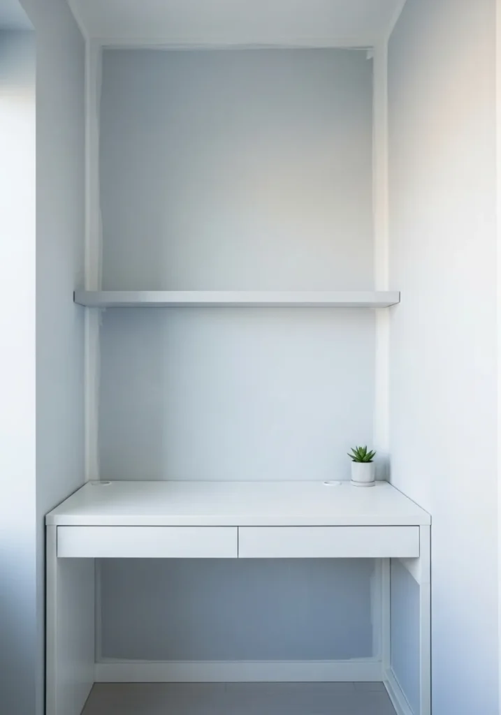 This petite alcove office is painted in a delicate ice blue that almost reads like a whisper of color. The pale tone reflects light softly, making the narrow walls feel wider and brighter. A sleek white desk sits neatly against the back wall, paired with a simple floating shelf above for storage. The minimal styling keeps the focus on the airy paint color, which gives the space a clean and serene look.