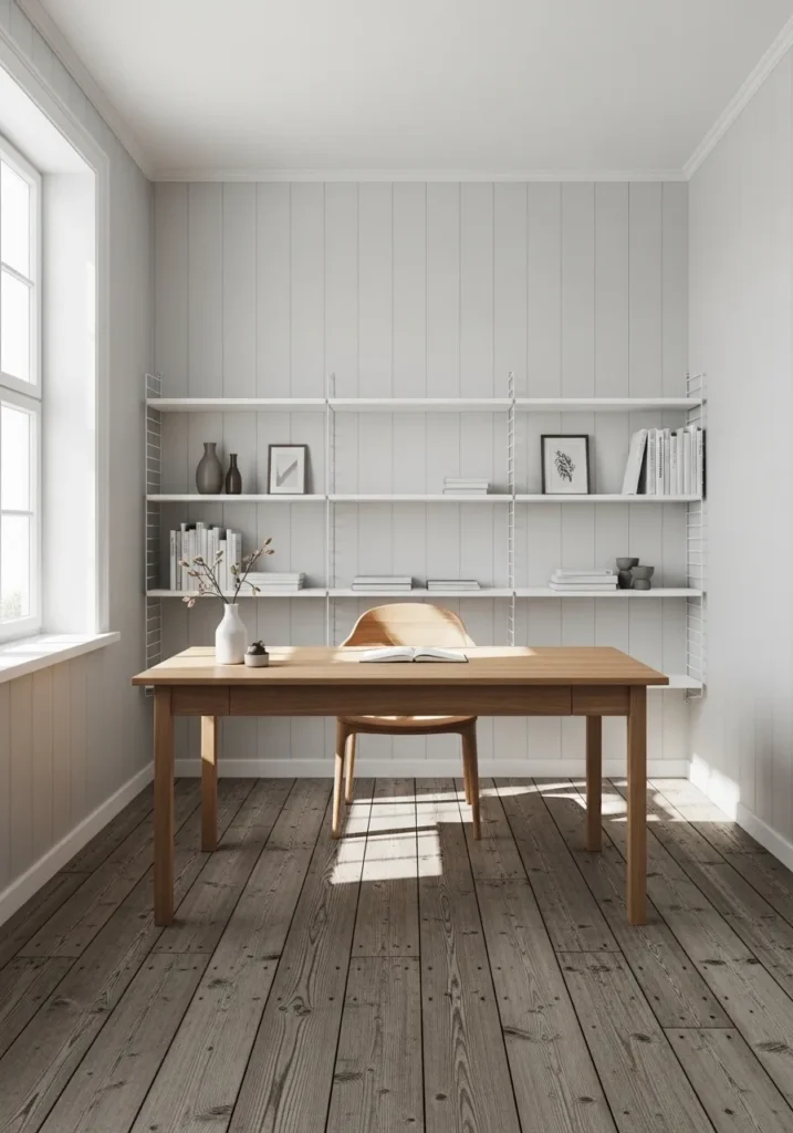 This small office embraces a bright white paint color that highlights the vertical wall paneling. The natural light from the window bounces off the white surfaces, making the room feel open and expansive. A simple wooden desk and floating shelves add warmth and contrast without taking away from the airy feel. The pale wood floors enhance the clean aesthetic and keep everything feeling cohesive.