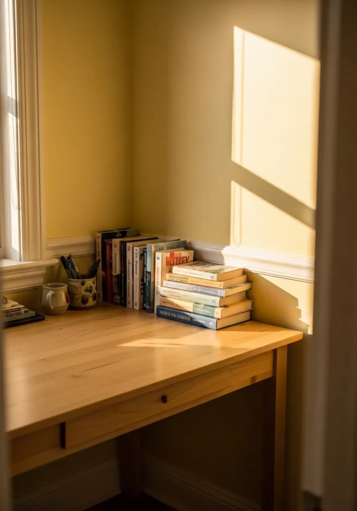 This small office corner is painted in a cheerful butter yellow that instantly brightens the space. The warm tone bounces sunlight around the room, especially where it hits the wall above the simple wooden desk. A neat stack of books and a few minimal accessories keep the surface practical but not cluttered. The crisp white trim creates a subtle contrast that makes the yellow look even more vibrant without feeling overwhelming. Even though the footprint is compact, the color choice makes the room feel energized and welcoming.