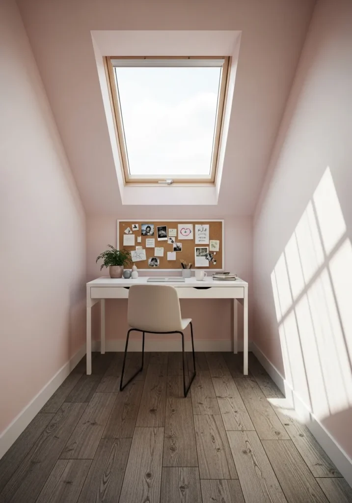 Blush Pink Attic Office With Skylight Glow