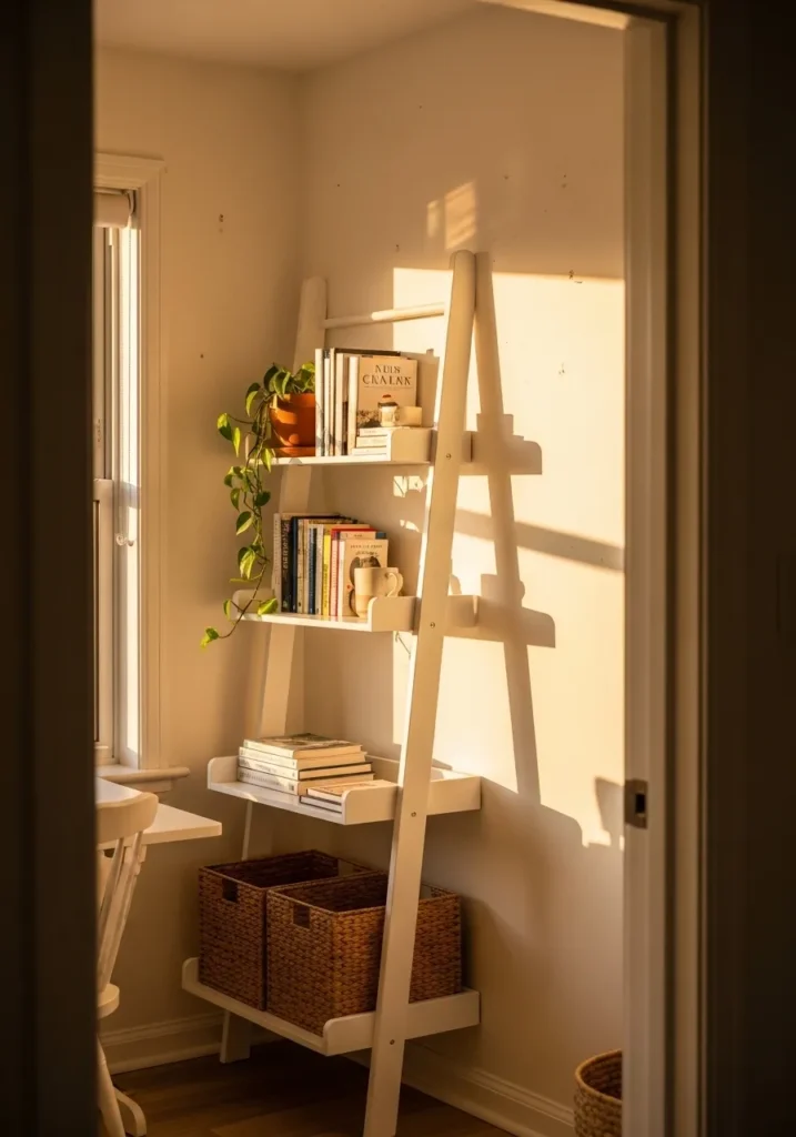 This compact office nook is painted in a soft warm beige that wraps the room in light. The tone works beautifully with the golden afternoon sunlight, creating gentle shadows that add depth without darkening the space. A ladder style shelf leans against the wall, styled with plants, books, and woven baskets for texture. The small desk fits neatly under the window, making the most of the natural light while keeping the layout functional.