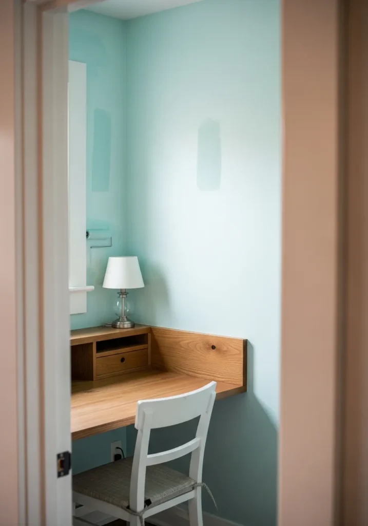 This charming corner office is painted in a soft sky blue that instantly brightens the narrow walls. The color catches the light beautifully near the doorway, creating subtle shadows that add dimension. Two simple wooden shelves float above a white desk, offering storage without crowding the space. The blue tone feels cheerful and open, which makes the small footprint feel less restrictive.