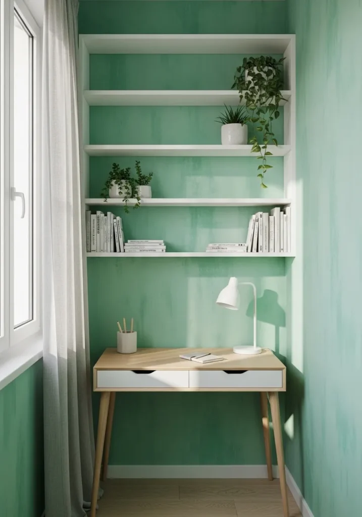 I love how this shade of green feels lively without being loud. It brings nature indoors in such a gentle way. In a small office, that connection to the outdoors makes a huge difference. I can imagine sitting here in the afternoon sun, feeling calm and focused at the same time.