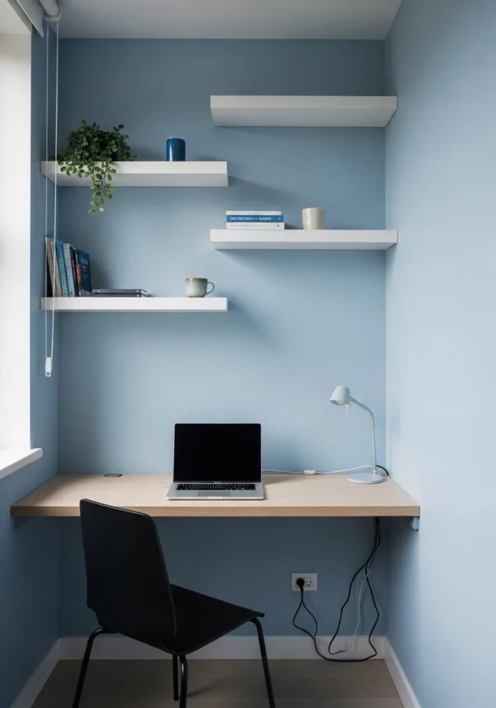 This tiny corner office is painted in a soft powder blue that reflects light beautifully across the walls. The shade feels cool and breezy, which helps the room feel larger than it actually is. A simple wood desk is tucked neatly into the corner, paired with a dark chair that adds subtle contrast. Minimal white floating shelves keep storage practical while maintaining an uncluttered look. The overall effect is clean, bright, and thoughtfully styled.