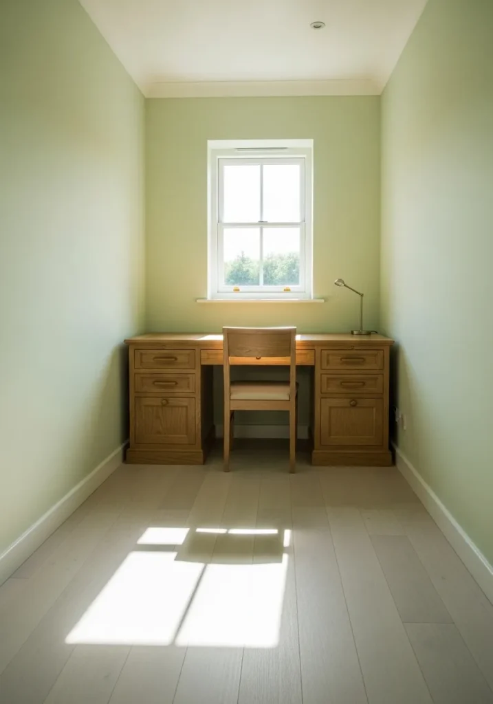 This narrow office is painted in a gentle sage green that softens the long walls and draws the eye toward the window at the end. The symmetrical layout with matching wooden cabinets and a centered desk creates a sense of order and balance. Natural light pours in from the window, casting a bright rectangle on the floor and making the sage color glow. The pale flooring and white ceiling keep everything feeling light and breathable.