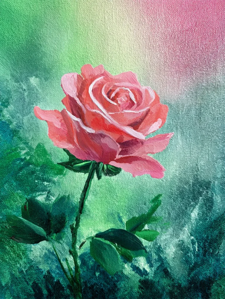 This design features a lush pink rose that takes center stage with its thick and textured petals. The artist used visible impasto strokes to give the flower a realistic 3D feel while keeping the leaves in a deep forest green for a nice contrast. The background transitions from a cool minty green at the bottom to a warm, blushing pink at the top, which creates a dreamy and ethereal atmosphere. The centered composition makes the delicate flower feel like a true star on the canvas.