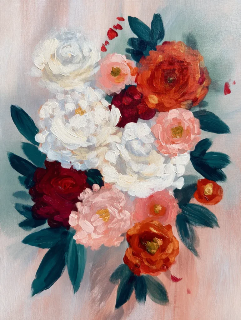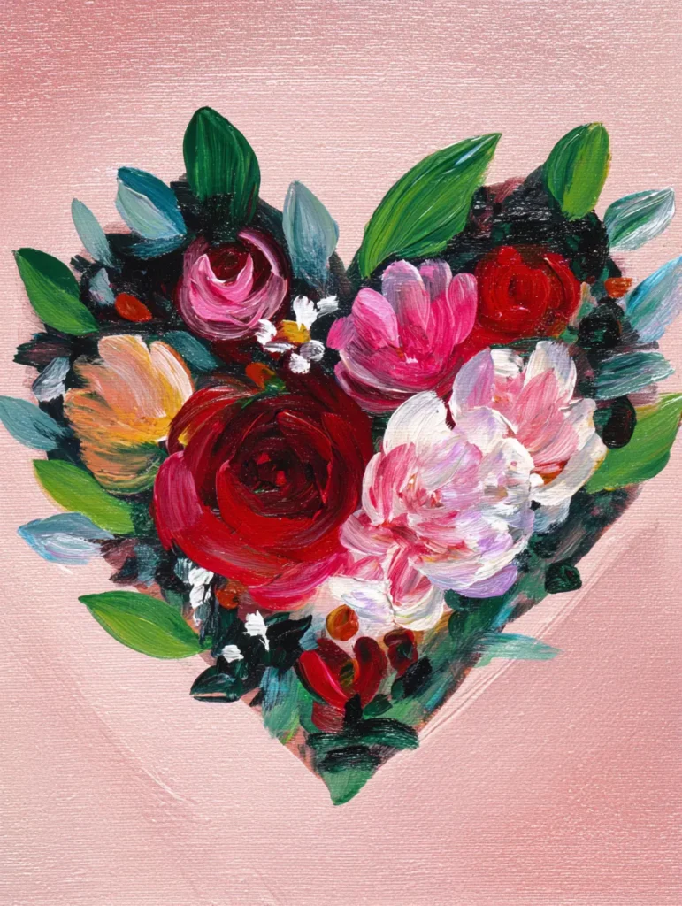 This romantic design features a variety of blooms cleverly arranged into a perfect heart shape. A large, deep crimson rose serves as the anchor, surrounded by delicate pink peonies, orange tulips, and tiny white accent flowers. The brushwork is thick and painterly, using a wet-on-wet technique that allows the colors to swirl together naturally within each petal. Set against a metallic blushing pink background, the composition feels centered and intentional, with dark forest green leaves poking out to define the heart’s crisp edges.