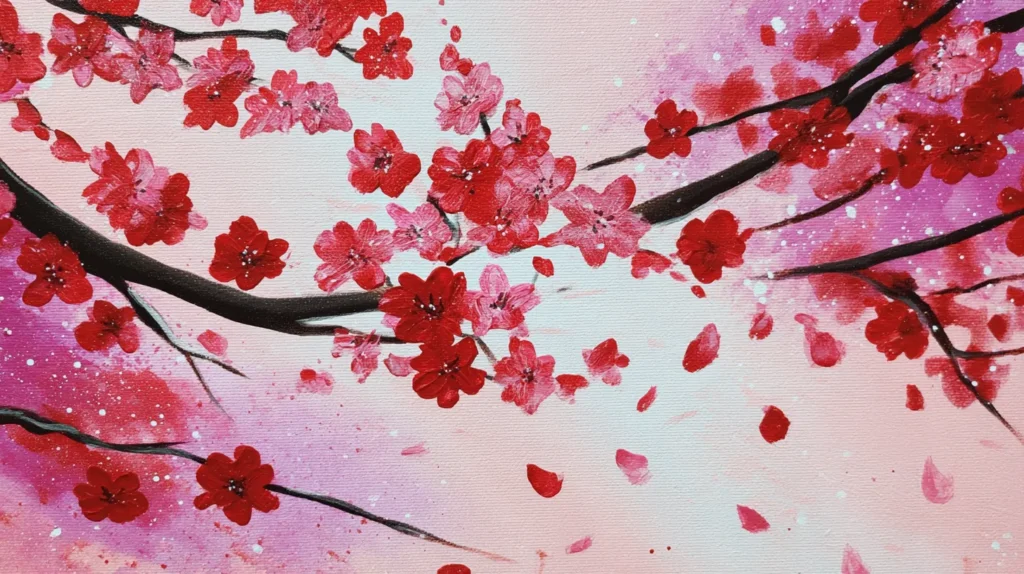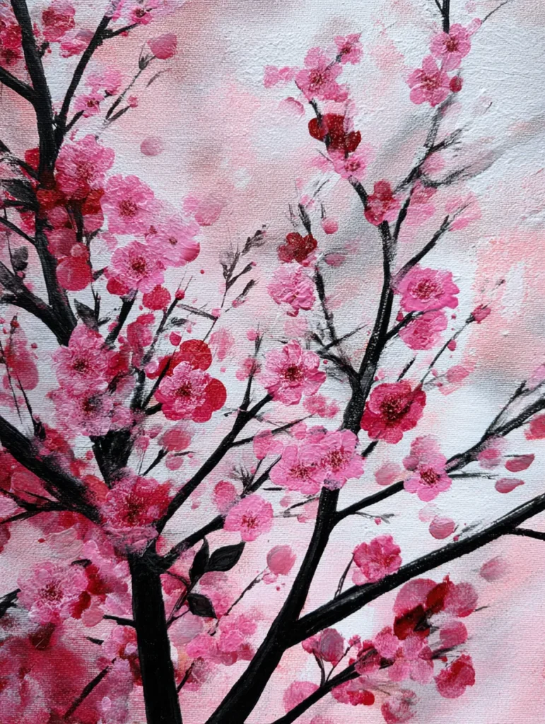 This dreamy painting captures the essence of spring with delicate cherry blossom branches reaching across a soft and textured background. The artist used jet black paint for the slender branches to create a striking silhouette against the pale pink and white sky. Each tiny blossom is formed with quick dabs of bubblegum pink and deep magenta to suggest clusters of flowers in various stages of bloom. The layout is wonderfully airy with plenty of negative space, which makes the intricate details of the petals feel light and weightless.