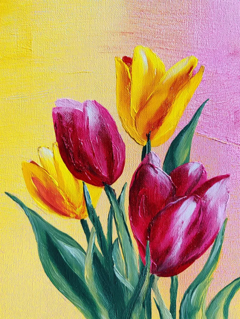 This vibrant design focuses on a small cluster of four tulips that stand tall against a striking dual-toned background. The canvas is split vertically between a bright sunny yellow on the left and a soft, blushing pink on the right, which creates an eye-catching and modern look. Each tulip is rendered with heavy impasto strokes that give the petals a beautiful ridged texture, while the rich magenta and golden yellow colors provide a wonderful contrast. The sleek green leaves at the bottom are painted with long, smooth motions to balance out the textured blooms and anchor the composition in the center of the frame.