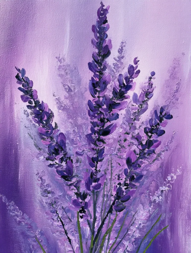 I am convinced that you will find this particular design a total blast to create because those textured purple dabs are so incredibly satisfying to layer. It is a wonderful way to practice your spatial awareness as you decide where to place each tall sprig for the most balanced look. You might notice that working with such a monochromatic palette of purples feels very peaceful and helps you focus on the tactile joy of the paint itself. This piece is a perfect choice for bringing a touch of calm and a bit of French countryside charm right into your favorite creative space.