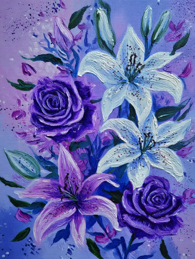 This striking arrangement combines elegant white and magenta lilies with deeply textured purple roses against a whimsical lavender backdrop. The artist used thick impasto strokes to give the white lily petals a sculptural quality, while the roses feature swirling circular motions that create a sense of lush volume. Splashes of violet and indigo paint are scattered like stardust around the blooms to add a touch of magic and movement to the composition. Dark pointed leaves and delicate flower buds are tucked between the main flowers to create a full and balanced layout that fills the vertical canvas beautifully.