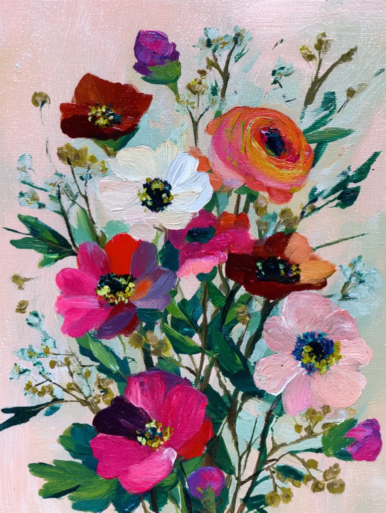 This whimsical design showcases a sprawling bouquet of anemones in shades of fuchsia, cream, and deep burgundy. The artist used bold and expressive brush strokes to define the wide petals while leaving the centers dark and textured for a dramatic contrast. Tiny sprigs of baby’s breath and golden wildflower buds are scattered throughout the composition to add a delicate and airy feel. Set against a soft blushing pink background, the vertical layout feels organic and lighthearted with various stems reaching upward at different angles to mimic a freshly gathered garden bunch.