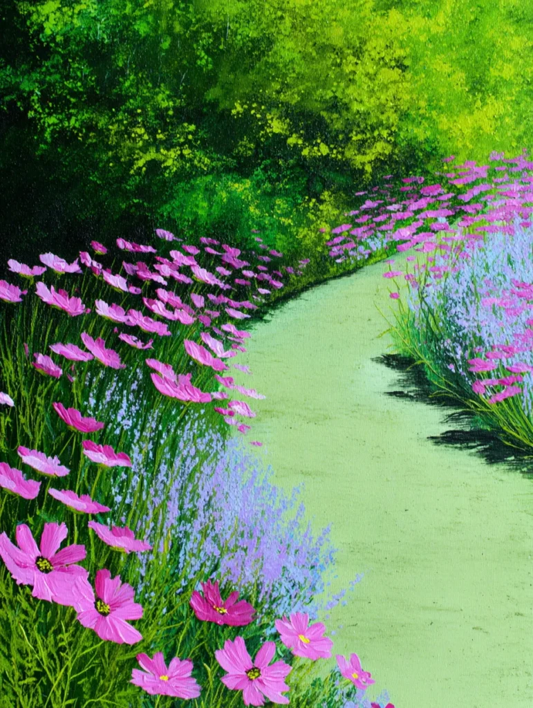 This scenic design features a winding garden path lined with vibrant pink cosmos and delicate lavender sprigs. The artist used short and rhythmic brush strokes to create a sense of lush greenery in the dense forest canopy above, while applying thicker paint for the foreground petals to make them pop. A soft lime green wash on the pathway suggests dappled sunlight filtering through the trees, which adds a beautiful glow to the entire scene. The curved composition draws your eye deep into the painting to create a wonderful feeling of depth and mystery.