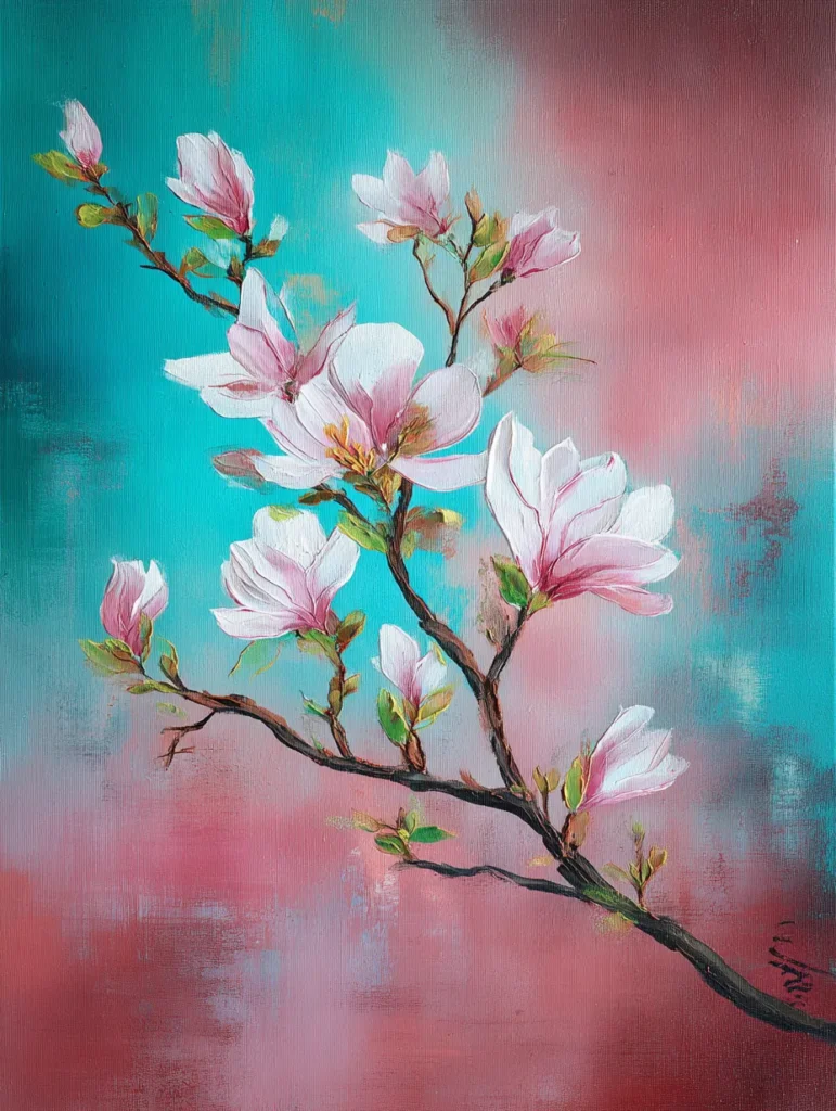 This elegant painting showcases a slender dark branch heavy with large white magnolia blossoms and soft pink buds. The artist used a striking split-background technique featuring a vivid turquoise on the left and a deep dusty rose on the right with textured dry-brushing throughout. Each flower is rendered with bold white impasto strokes that give the petals a sculptural feel, while thin yellow lines add detail to the centers. The composition follows a graceful diagonal line that pulls the eye across the beautiful color contrast of the background.