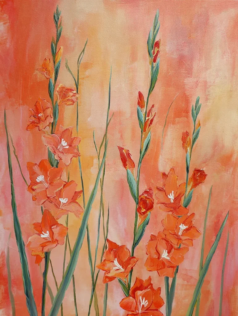 This final design features elegant stalks of orange gladiolus reaching toward the top of the frame in a beautiful vertical display. The artist used a warm and fiery background of blended apricot and coral tones with visible vertical strokes that echo the height of the flowers. Each blossom is painted with quick and confident dabs of pumpkin orange while tiny white highlights at the centers add a touch of crisp detail. Long and slender green leaves slice through the warm background to provide a cool contrast and a sense of natural structure to the overall layout.