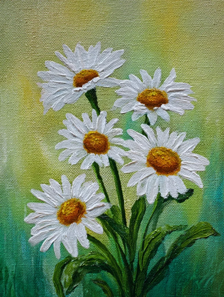 These cheerful daisies pop against a vibrant background that blends zesty lime green with hints of soft lemon yellow. Each flower features thick white petals painted with bold, textured strokes that give them a wonderful tactile quality. The centers are a warm honey gold, while the deep green leaves at the bottom anchor the bunch perfectly. The overall layout feels like a fresh bouquet picked straight from a summer meadow and placed right in the middle of your view.