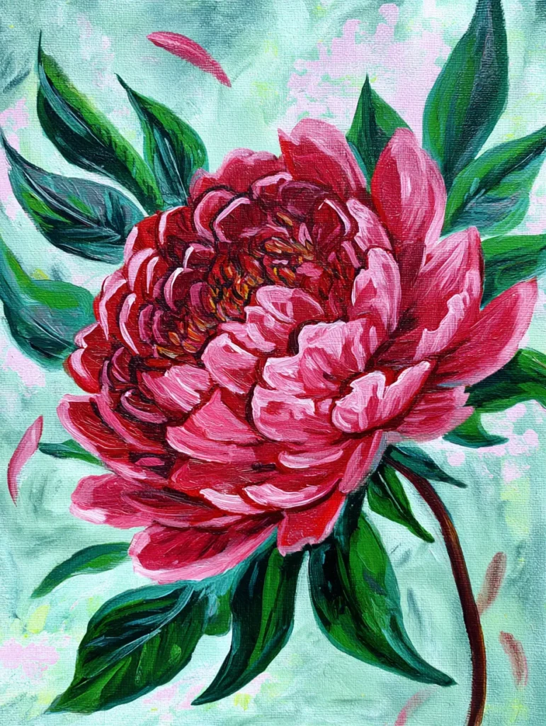 This stunning design showcases a large peony bursting with rich magenta and crimson tones that fill almost the entire frame. The brushwork is incredibly detailed, with tiny highlights on each petal to create a sense of deep volume and movement. Sharp emerald green leaves frame the bloom, while a pale mint background with splashes of light pink provides a soft contrast. The composition is dynamic and slightly off-center, which gives the flower a natural and lifelike appearance as if it were swaying in a gentle breeze.