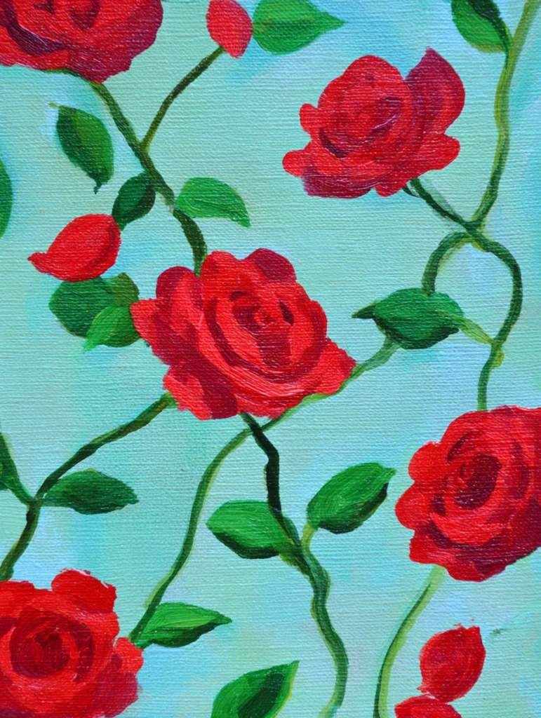 This charming design features a series of vibrant red roses and buds winding gracefully across the canvas. The artist used a light mint green background that makes the rich crimson of the petals truly pop. Each flower is painted with swirling brush strokes to create a sense of rounded fullness, while the thin green vines connect the blooms in a playful zigzag pattern. The overall layout feels like a snippet of a romantic cottage wall covered in summer growth.