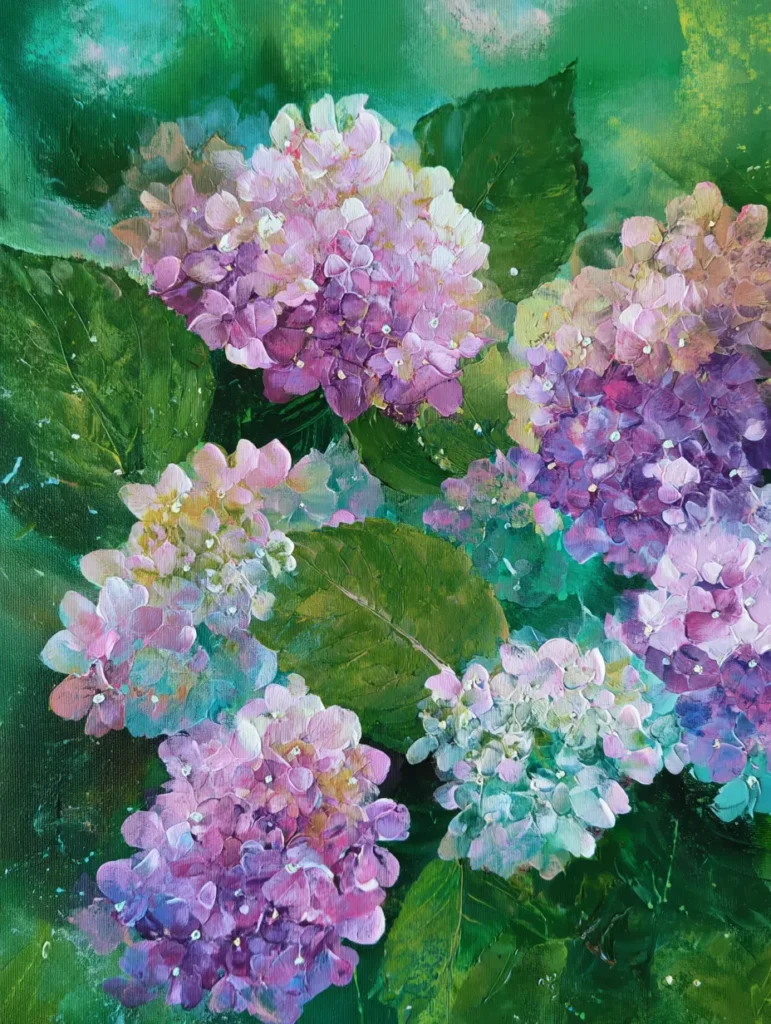 This gorgeous design fills the canvas with lush clusters of hydrangeas in varying shades of lilac, soft pink, and deep violet. The artist used dabbing motions with a small brush to create the illusion of hundreds of tiny petals, giving each flower head a wonderful sense of roundness and texture. Large forest green leaves provide a bold backdrop that anchors the pastel blooms, while tiny white flecks suggest a light morning dew. The layout is wonderfully full and immersive, making you feel like you are peering directly into a thick garden bush.