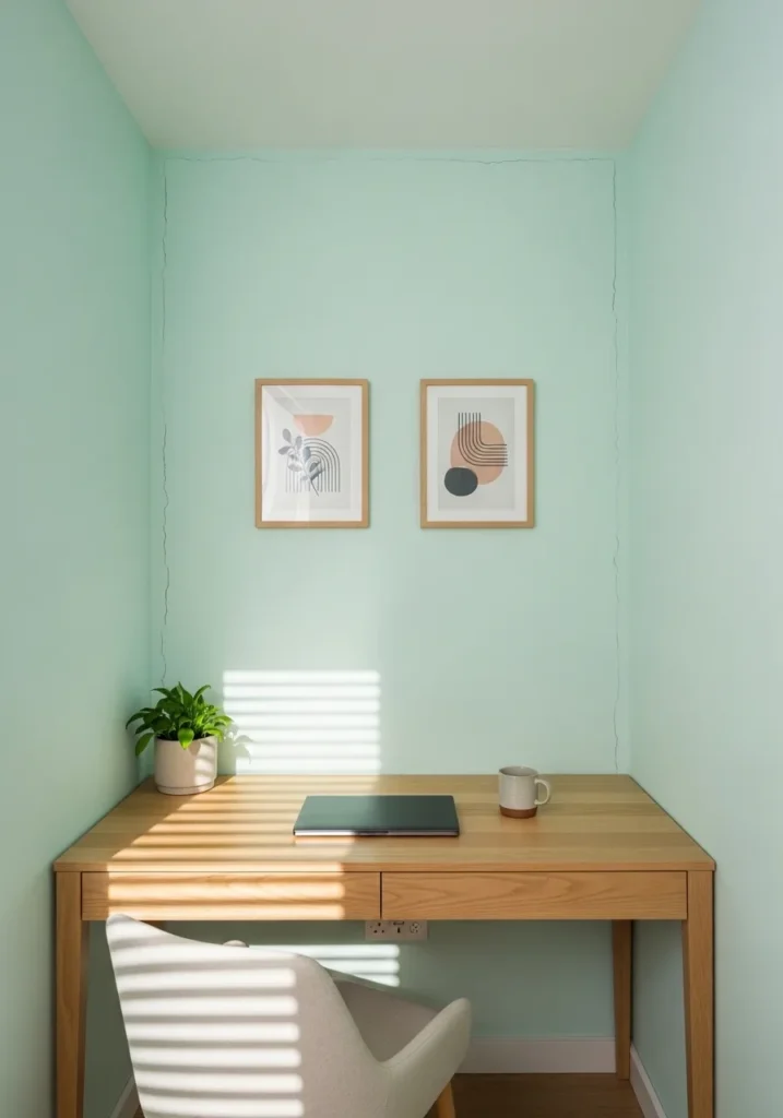 This tiny desk corner is painted in a refreshing mint green that instantly lightens the mood. The soft pastel tone brightens the walls while still adding personality. A simple wooden desk stands against the wall, paired with minimal artwork that keeps the look airy. Natural light creates delicate shadow lines across the mint surface, adding depth without darkening the room.