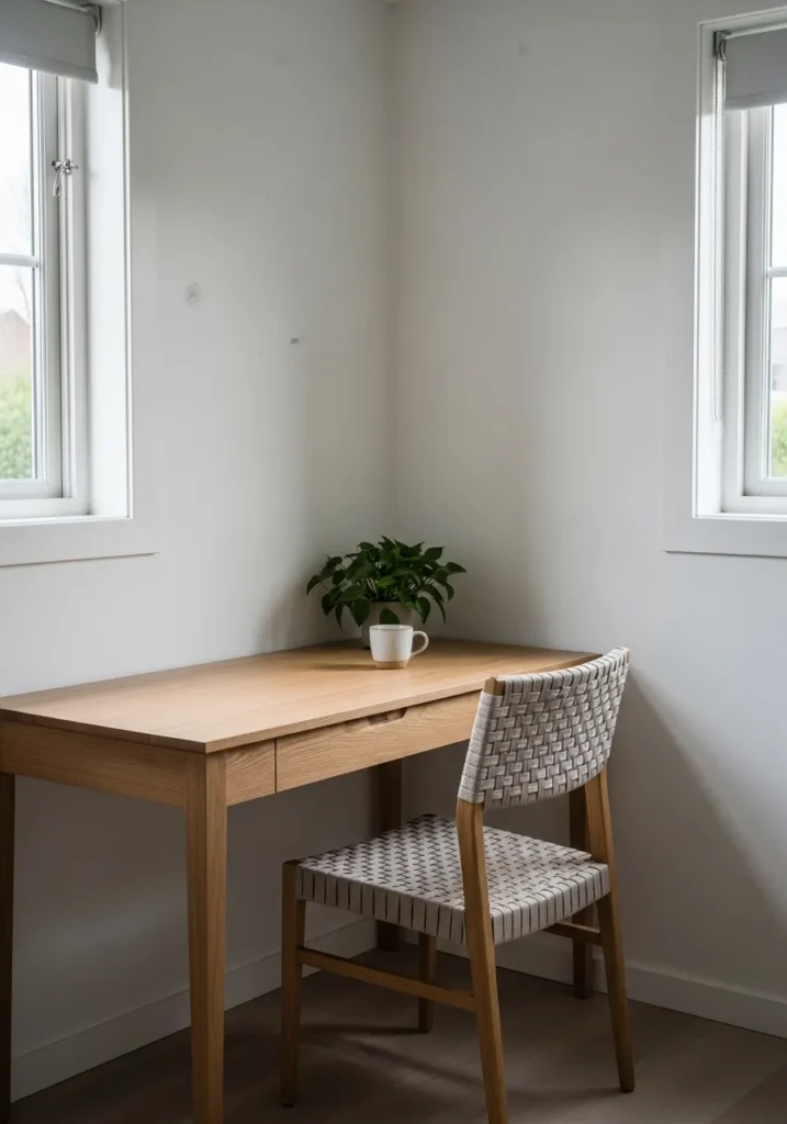 This petite desk corner features a powder blue paint that brightens the walls and lifts the ceiling visually. The soft blue tone reflects daylight beautifully, making the small footprint feel more open. A simple white desk and cork board keep the styling practical and uncluttered. The overall look feels light, clean, and quietly cheerful.