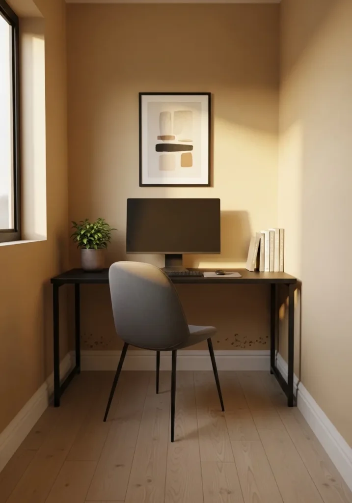 I think this shade is such a smart move for a small office that needs warmth without heaviness. It feels inviting and polished at the same time. The soft beige makes the space feel bigger while still giving it personality. It is the kind of color that makes even a quick work session feel a little more special.