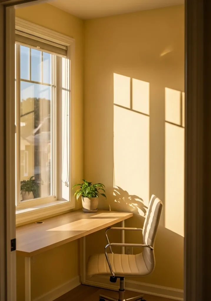 This compact office nook uses a creamy sand paint that brightens the walls without going stark white. Floating wooden shelves add vertical interest and keep storage off the floor, which makes the room feel taller. The soft neutral backdrop allows the wood tones to stand out beautifully. Sunlight casts gentle shadows that add depth without darkening the small space.