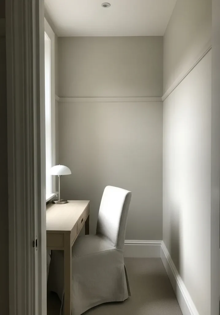 This narrow hallway office is painted in a soft greige that blends gray and beige beautifully. The neutral tone smooths out the long walls and keeps the space feeling cohesive. A slim desk and light upholstered chair maintain an uncluttered look. Gentle natural light reflects off the muted walls and enhances the sense of openness.