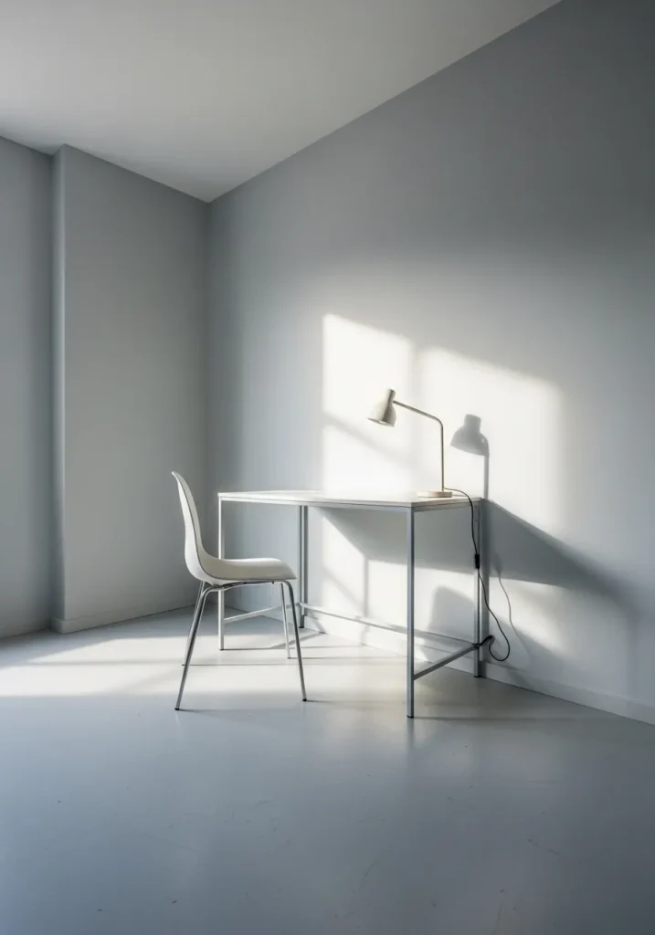 This small office embraces a cool light gray tone that gives it a sleek and contemporary feel. The gray walls create a gentle contrast against the white desk and chair, adding depth without making the room feel dark. Sunlight streaming in casts soft shadows that highlight the clean lines of the space. The monochrome palette keeps everything calm and visually spacious.