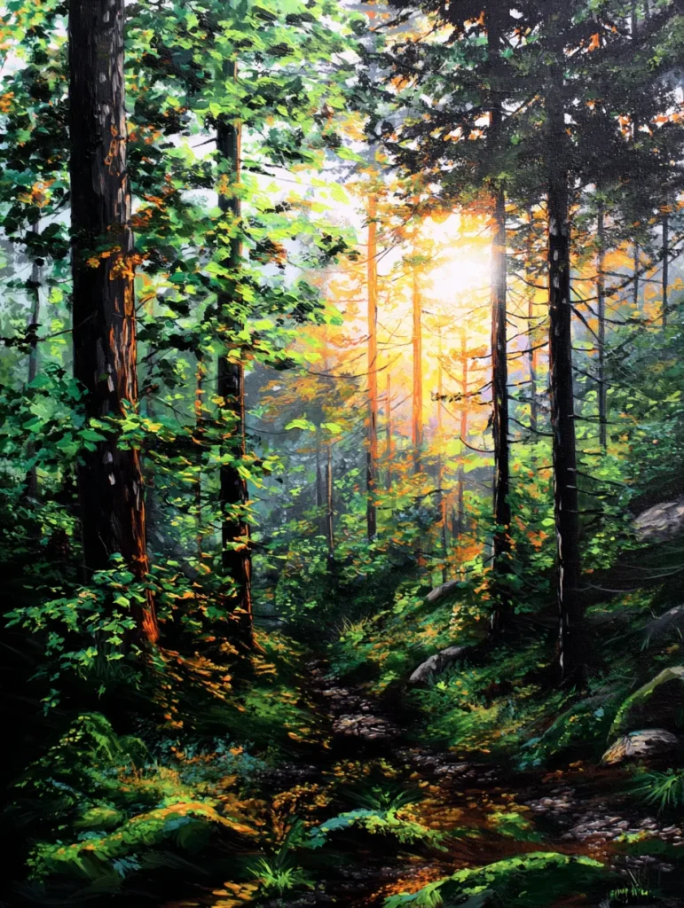 I think recreating this at home is such a mood booster because you get to play with light and shadow in a way that feels really rewarding. There is something so peaceful about blending those bright oranges into the dark greens to see the forest come alive on your canvas. It is a total win for a bedroom since it brings that quiet morning energy indoors. I am definitely leaning toward this design for anyone who wants their space to feel like a calm sanctuary.