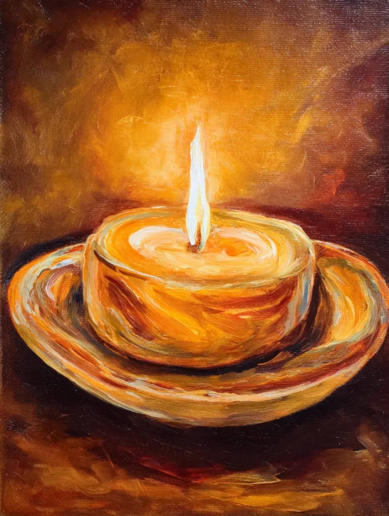 This design features a single thick candle sitting on a saucer, radiating a warm and golden glow. The color palette is dominated by rich ambers, burnt siennas, and creamy yellows that highlight the melted wax and the flickering flame. Bold, circular brush strokes emphasize the shape of the candle and the saucer, while the background is a soft, blurred wash of dark chocolate and orange tones. The overall layout is intimate and centered, creating a focused sense of warmth that feels like a quiet evening at home.