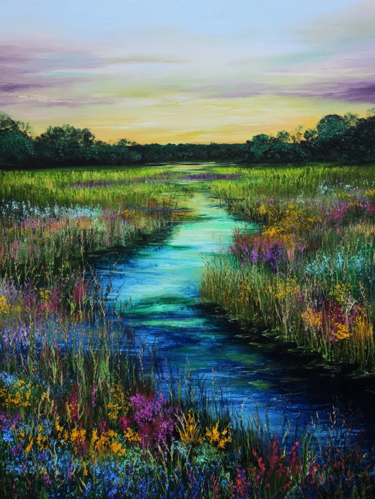 This painting features a gentle stream winding through a vibrant meadow under a soft lavender and gold sky. The layout uses vertical grassy strokes and tiny dabs of pink, yellow, and blue to create a field of wildflowers lining the water. Smooth, horizontal blending in the sky contrasts with the textured green riverbanks, while the stream itself reflects the turquoise and deep blue tones of the landscape. A line of dark, distant trees anchors the horizon, giving the scene a wonderful sense of depth and quietude.