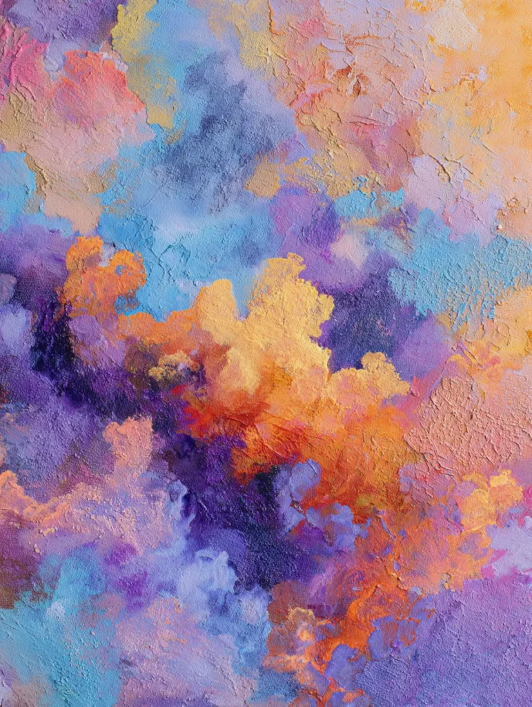 This design is a dream for anyone who loves rich tactile surfaces and a vibrant sky. The composition is a vertical abstract explosion of fluffy cloud shapes in shades of lavender, apricot, and deep violet. Thick dabs of paint applied with a palette knife create a rugged texture that mimics the look of a heavy overcast sky catching the evening light. The layout feels spontaneous and energetic with soft blues and sandy beiges peeking through the bolder oranges and purples to create a sense of light moving behind the clouds.