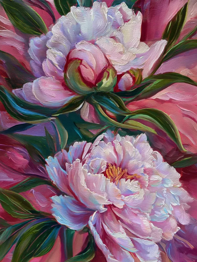 This design features two large peonies that practically pop off the canvas with their lush and layered petals. The color palette is a dream for any bedroom because it mixes soft whites and pale pinks with deep fuchsia and moody magenta backgrounds. Thick and textured brush strokes give the flowers a realistic weight, while the sweeping dark green leaves add a nice touch of contrast. The composition feels very organic as the blooms fill most of the frame to create a sense of abundance and natural beauty.