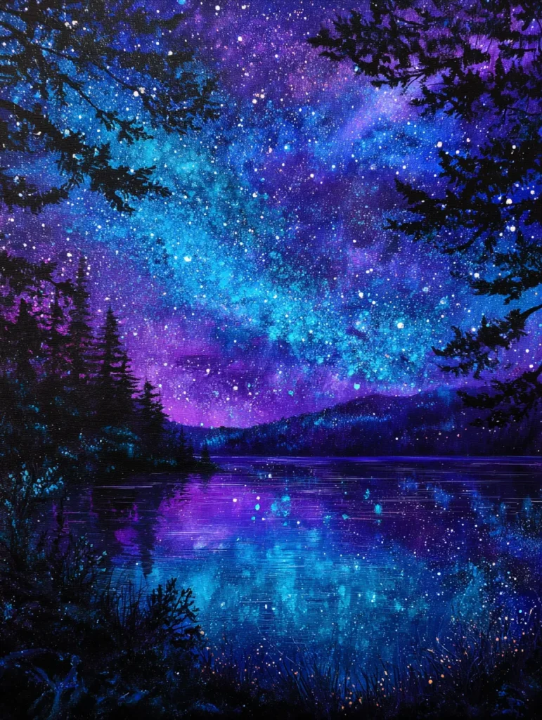 This enchanting scene captures a brilliant galaxy swirling above a quiet lake surrounded by dark evergreen silhouettes. The color palette is packed with vibrant indigo, electric turquoise, and deep violet tones that blend together to create a glowing celestial effect. Splattered white paint dots mimic distant stars and flickering fireflies while the horizontal strokes on the water create a perfect glassy reflection. The composition uses the dark trees as a natural frame, which pulls your eye right into the center of that sparkling night sky.