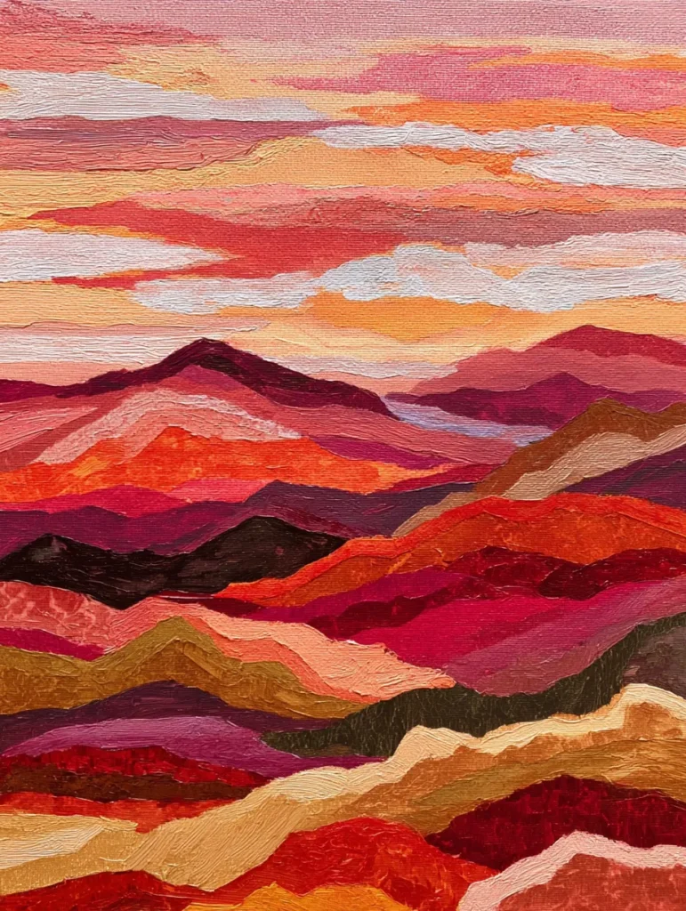 This design features a stylized mountain range made of sweeping horizontal layers in rich earthy tones. The color palette is full of warm terracotta, deep crimson, burnt orange, and sandy beige, creating a desert sunset vibe. Every mountain peak is defined by thick, impasto-style brush strokes that add a lovely physical texture to the canvas. The layout is stacked vertically, with the darkest reds at the base moving up toward a soft peach and cream sky, making the whole composition feel grounded and balanced.