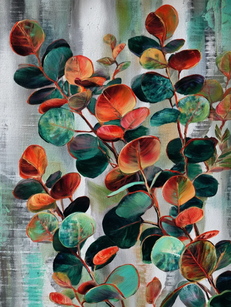 This painting focuses on a cluster of rounded eucalyptus leaves that feature a unique mix of earthy terracotta, burnt orange, and deep forest green. The background is kept simple with muted gray and sage green vertical textures that allow the vibrant foliage to stand out. Each leaf is defined by smooth, curved strokes and thin stems that create a rhythmic and balanced layout. The overall composition feels modern yet cozy because of the way the warm and cool colors play together on the canvas.