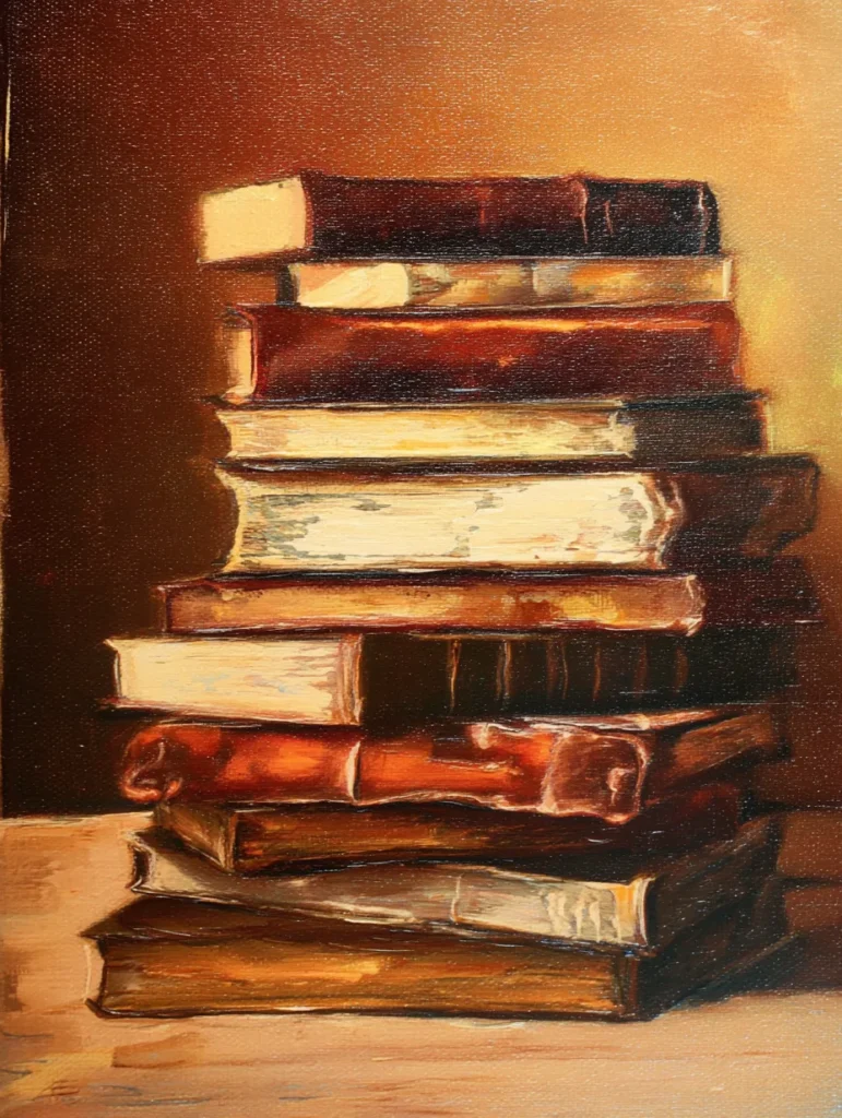 This design includes a tall, slightly leaning pile of weathered hardcover books in a range of sepia, mahogany, and cream tones. The composition is a classic vertical still life with the books stacked unevenly, suggesting a well-loved personal collection. Visible brush strokes create a worn texture on the spines and pages, while a soft golden light washes over the scene from the side, casting gentle shadows that give the books a realistic 3D feel. The background is a simple, dark ochre gradient that makes the rich leather and paper textures of the stack really stand out as the main focus.