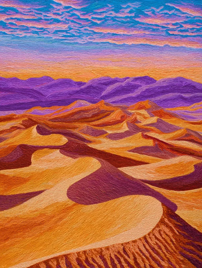 This landscape features rolling dunes painted with incredibly thick and expressive brush strokes that create a rhythmic corduroy texture across the canvas. The color palette transitions from warm ochre and burnt orange in the foreground to cool lilac and deep grape purple in the distant mountain peaks. Wispy blue and pink clouds streak across the sky to mirror the wavy lines of the desert below. The layered composition gives the piece a wonderful sense of depth, while the consistent impasto technique makes the entire scene feel tactile and alive.