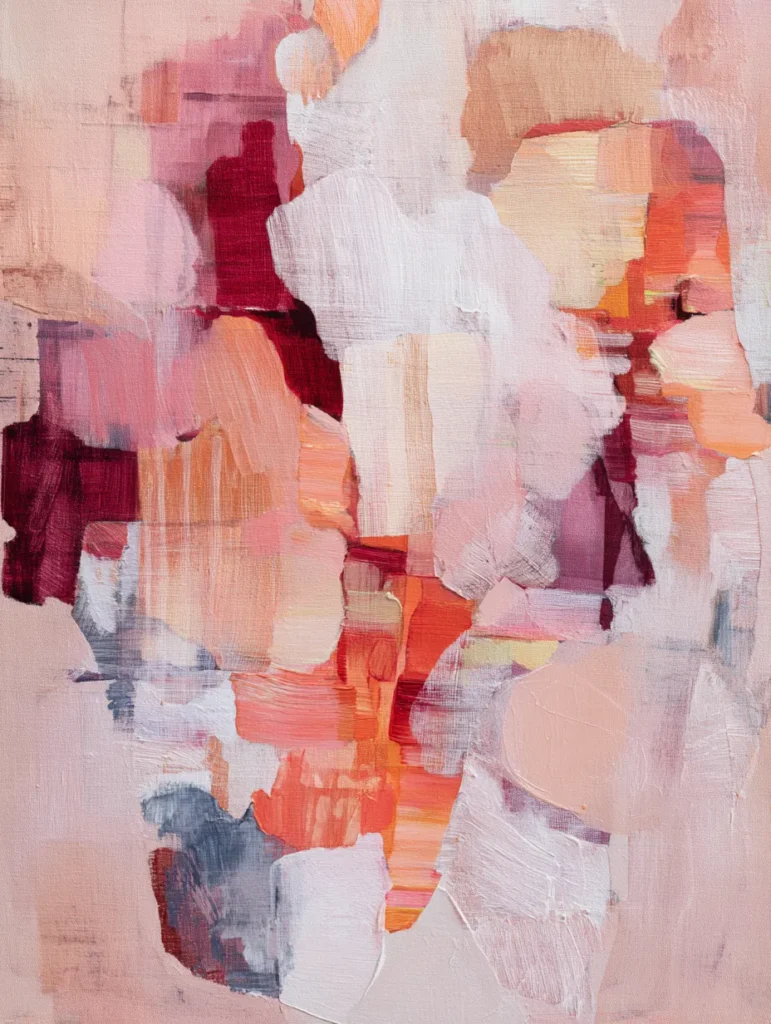 This design is a masterclass in soft minimalism, featuring large, overlapping blocks of color in a palette of peach, cream, and dusty rose. The layout is wonderfully balanced with a few pops of deep burgundy and slate gray that ground the lighter tones. Wide, flat brush strokes create a smooth yet slightly textured surface where the colors bleed into one another at the edges. It is a very clean and modern composition that feels light and airy on the canvas.