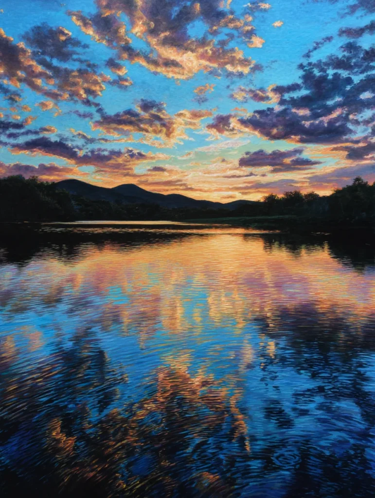 This design captures the magical moment when the sky turns into a masterpiece of blue and gold over a quiet lake. The layout features a wide horizon with dark mountain silhouettes and soft trees lining the water’s edge. What really stands out are the fluffy clouds painted with dabs of apricot, violet, and creamy white against a bright azure backdrop. The bottom half of the canvas mirrors the sky perfectly, using rhythmic horizontal strokes to create the look of gentle ripples on the surface. It is a stunning balance of vibrant color and calm water that feels incredibly open and airy.