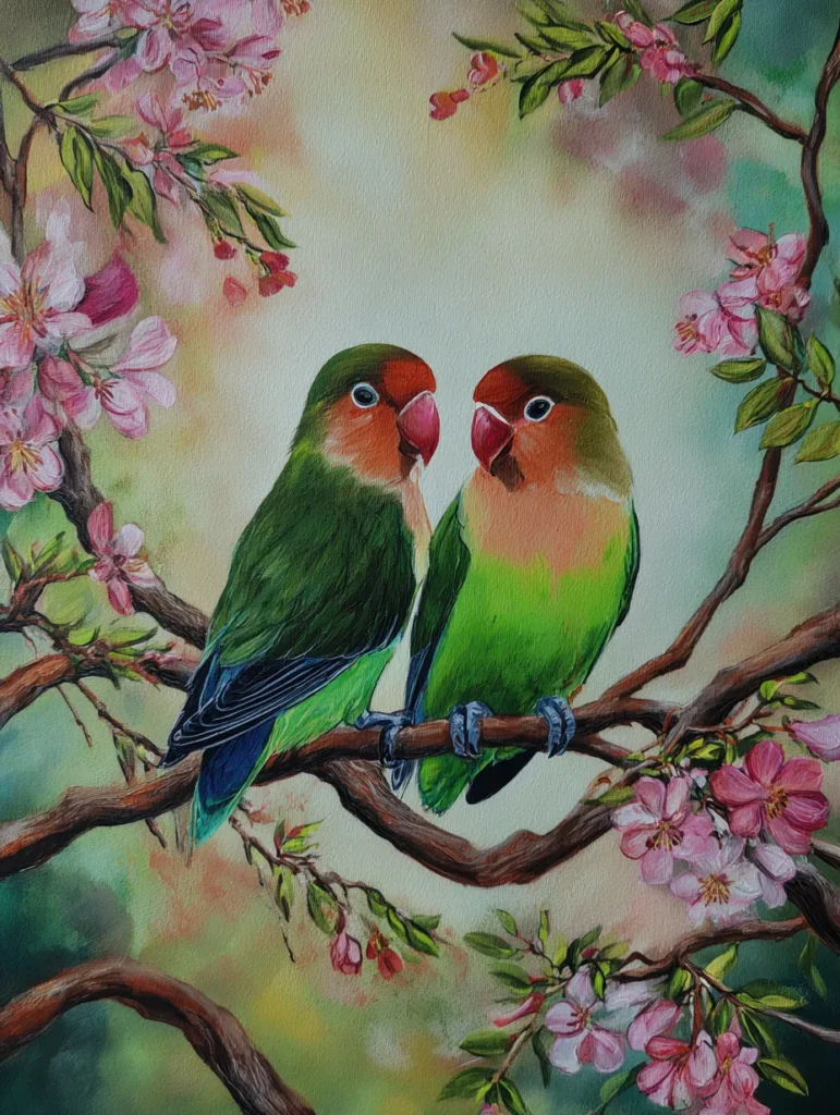 This piece captures two vibrant lovebirds, perfectly centered and cuddled up together on a textured tree branch. They are surrounded by lovely clusters of pink cherry blossoms and delicate green leaves on gracefully curving boughs. The background is a soft blend of warm, pastel colors like soft oranges, greens, and cream, giving it a gentle and dreamy feeling. You can really see the detail and brushstrokes in the feathers and flower petals, adding so much life and texture to the whole painting.